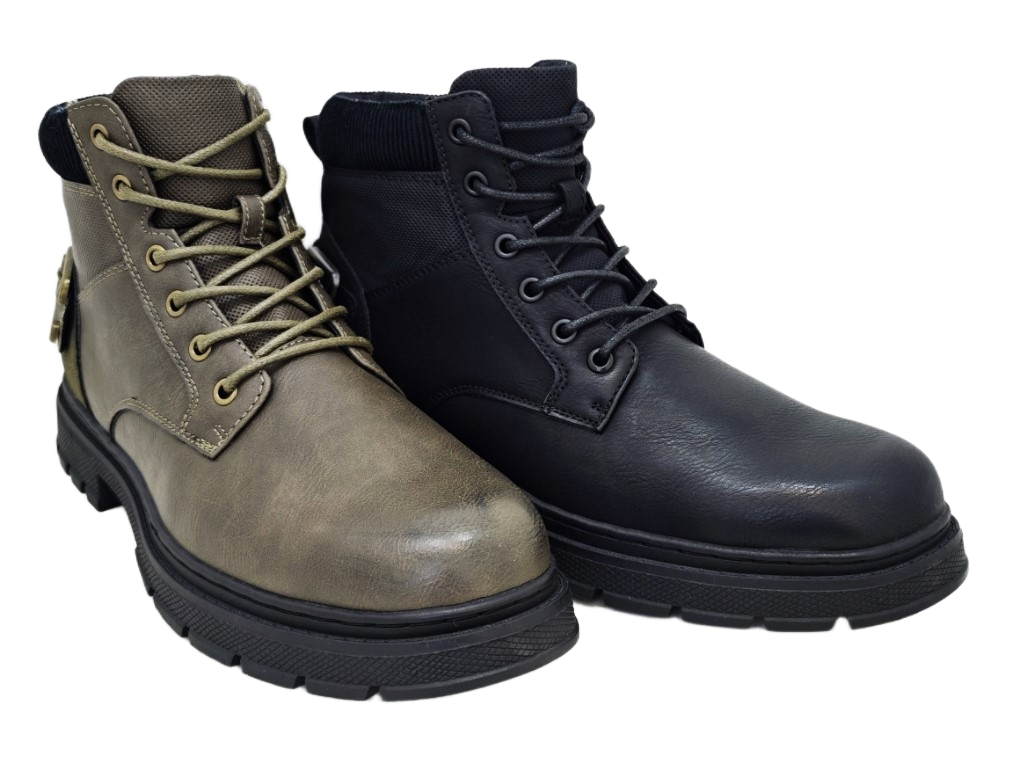 Dostupne u klasičnoj crnoj i modernoj kaki boji, lako se uklapaju u svaki outfit. Praktični patentni zatvarač sa unutarnje strane omogućuje brzo i lako obuvanje. Debelji, neklizajući đon osigurava stabilnost na svakoj podlozi.Metalne alke za pertle i kvalitetna izrada garantuju dugotrajnost.