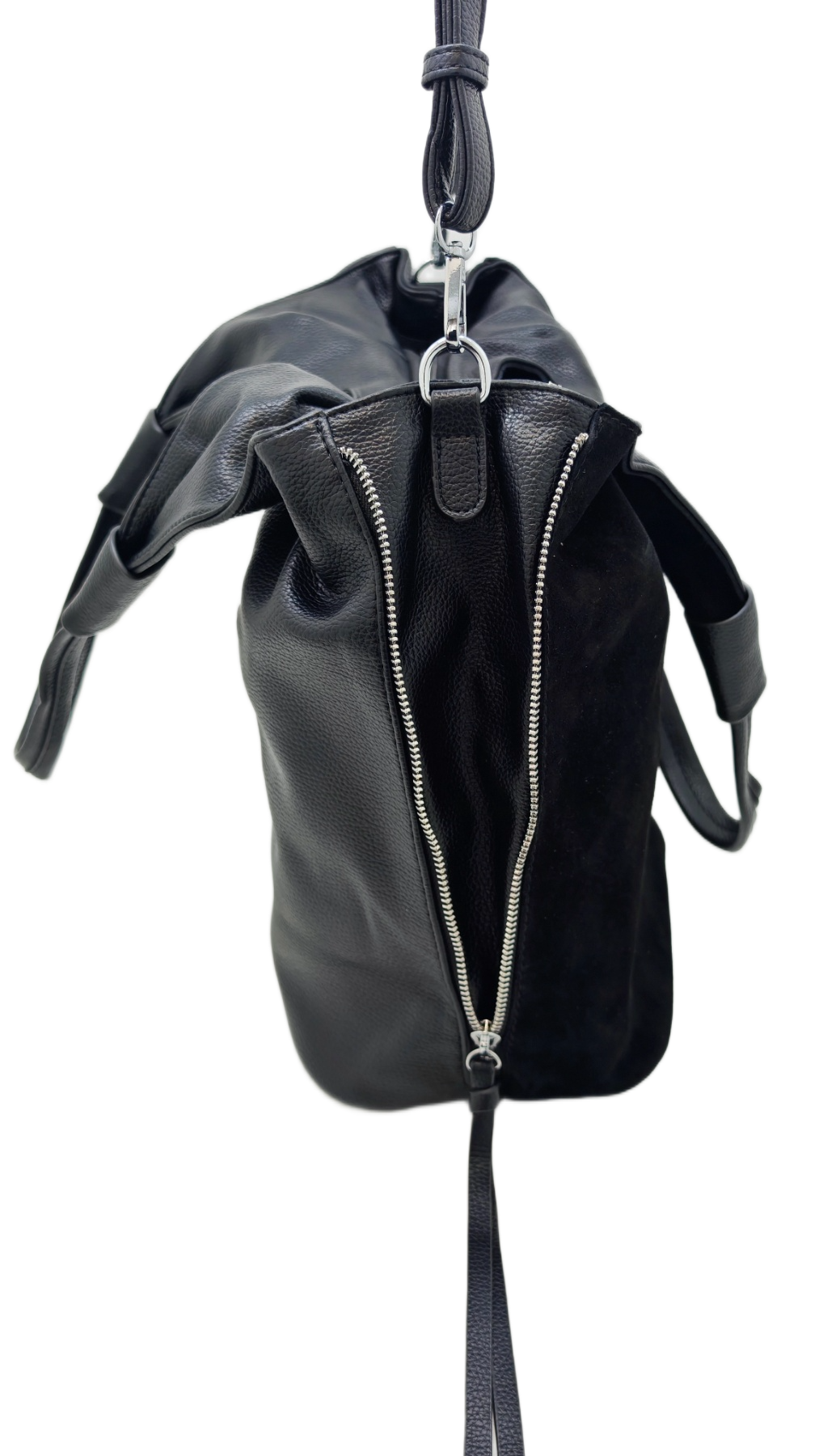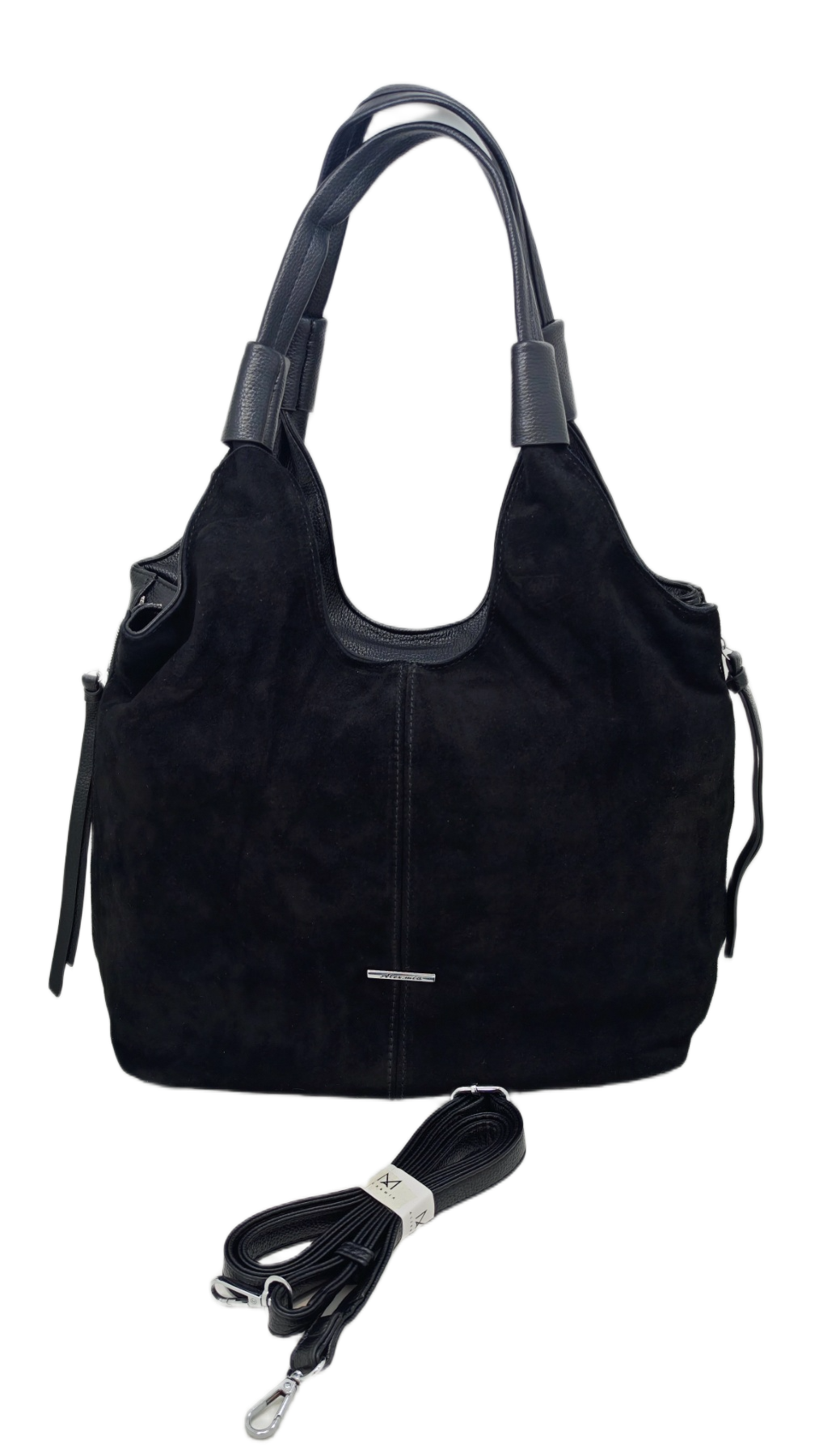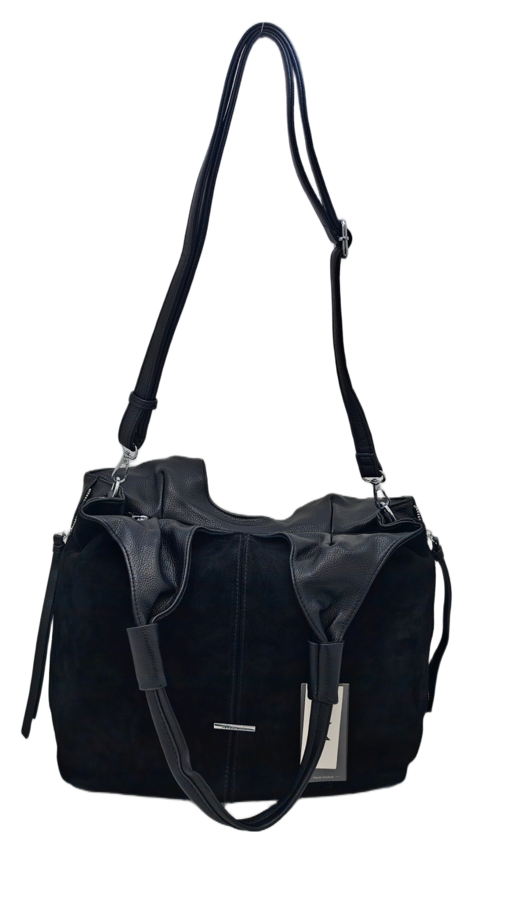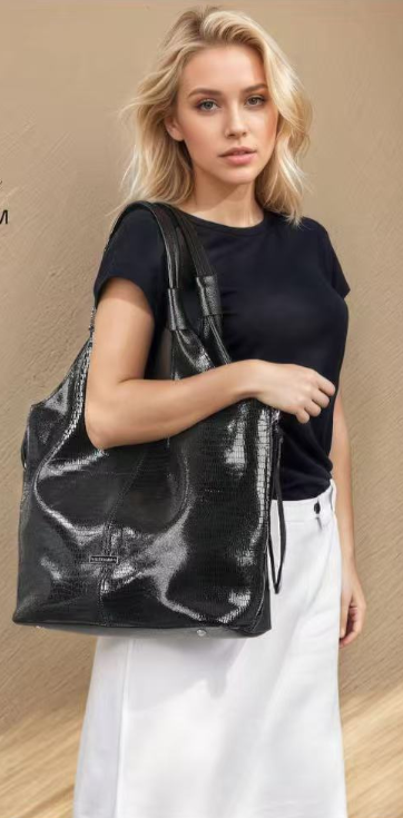 Izrađena od visokokvalitetnog materijala eko velur (umjetni materijal) u klasičnoj crnoj boji. Karakterizira je opušteni hobo stil s modernim detaljima. Istaknuti srebrni patentni zatvarači s obje strane dodaju edgy notu i funkcionalnost. Ovaj model dolazi s kratkim remenom za nošenje preko ramena i dodatnim, podesivim dužim remenom za nošenje preko tijela (crossbody). Idealna za dnevne i večernje kombinacije, nudi dovoljno prostora za sve potrepštine.