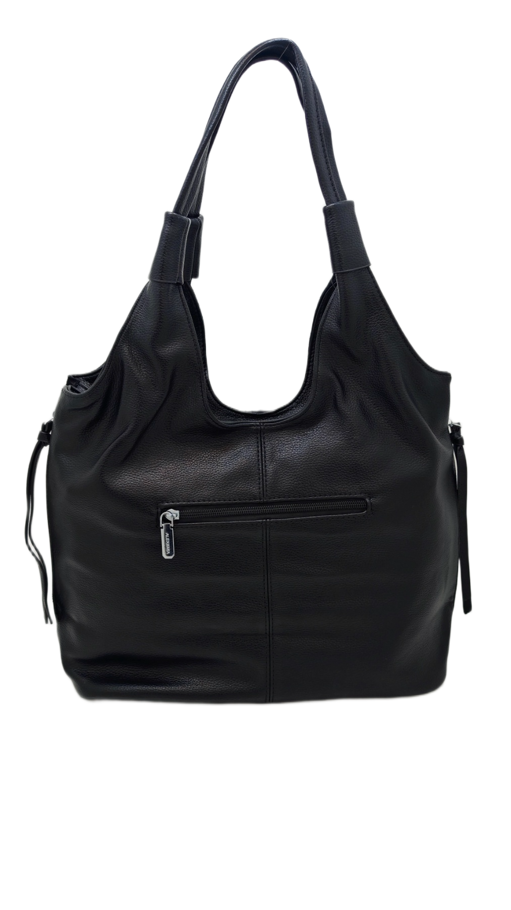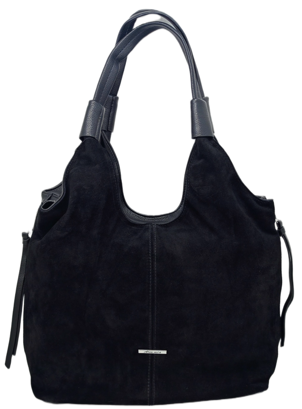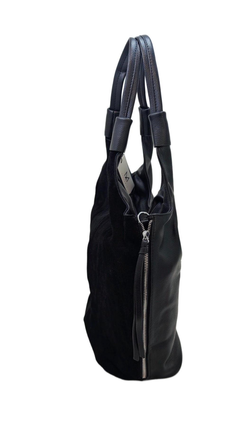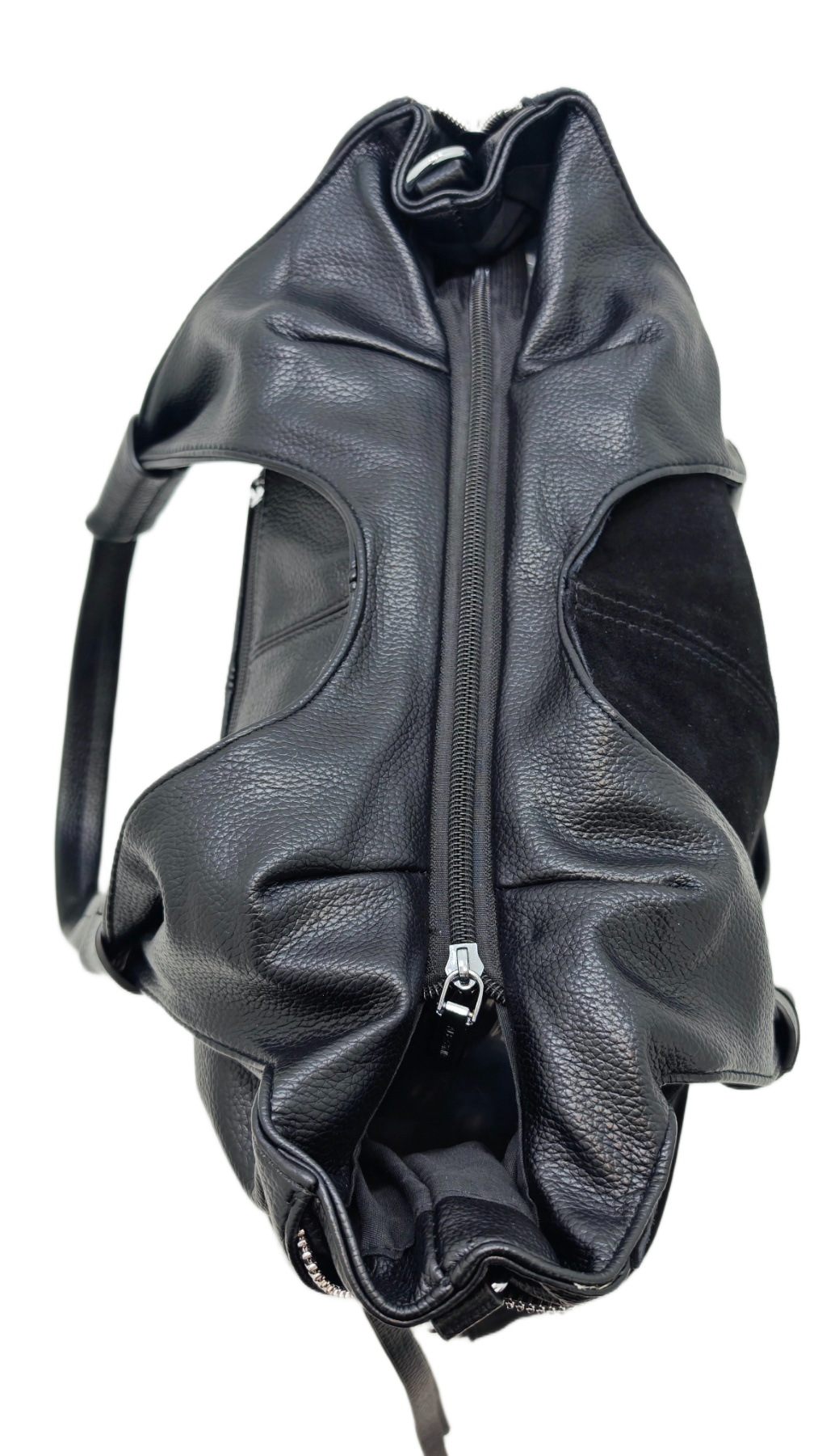 Izrađena od visokokvalitetnog materijala eko velur (umjetni materijal) u klasičnoj crnoj boji. Karakterizira je opušteni hobo stil s modernim detaljima. Istaknuti srebrni patentni zatvarači s obje strane dodaju edgy notu i funkcionalnost. Ovaj model dolazi s kratkim remenom za nošenje preko ramena i dodatnim, podesivim dužim remenom za nošenje preko tijela (crossbody). Idealna za dnevne i večernje kombinacije, nudi dovoljno prostora za sve potrepštine.