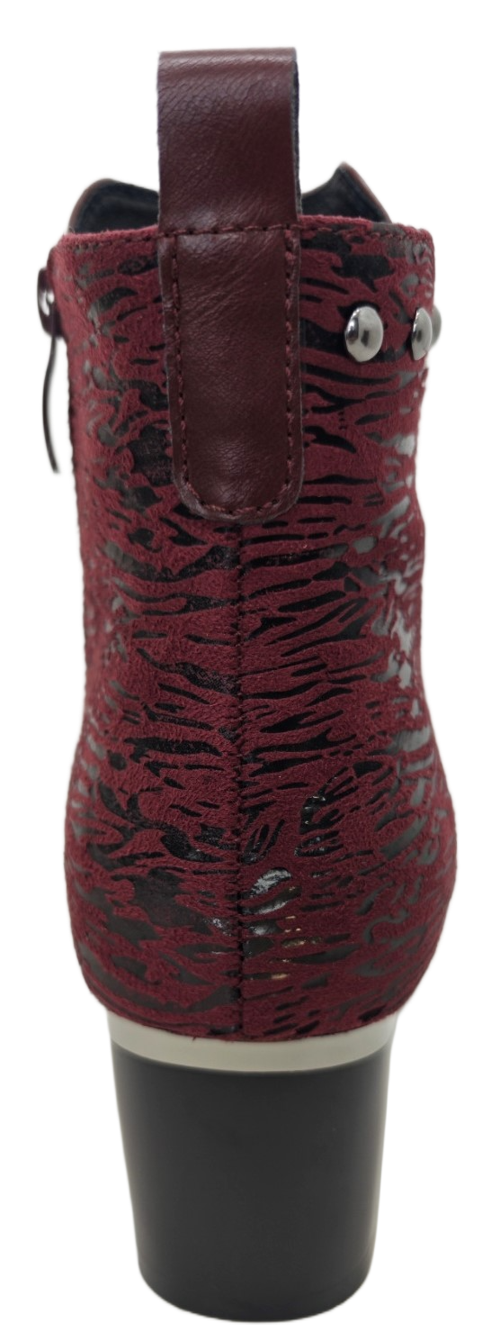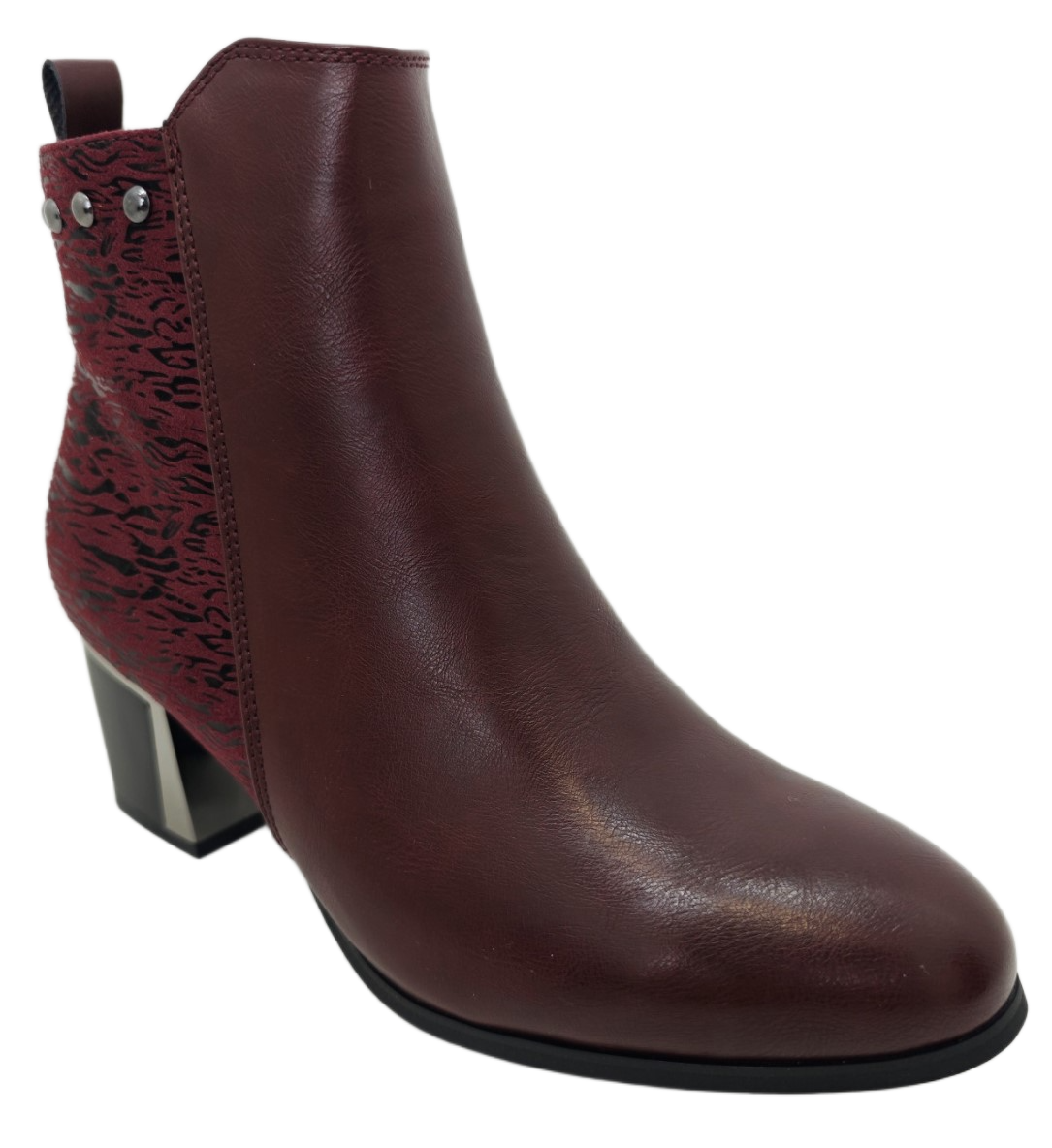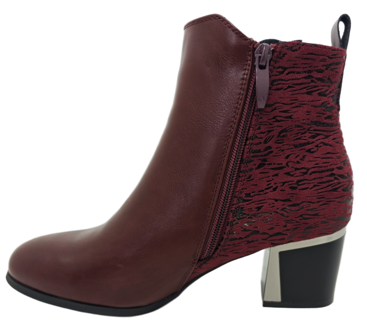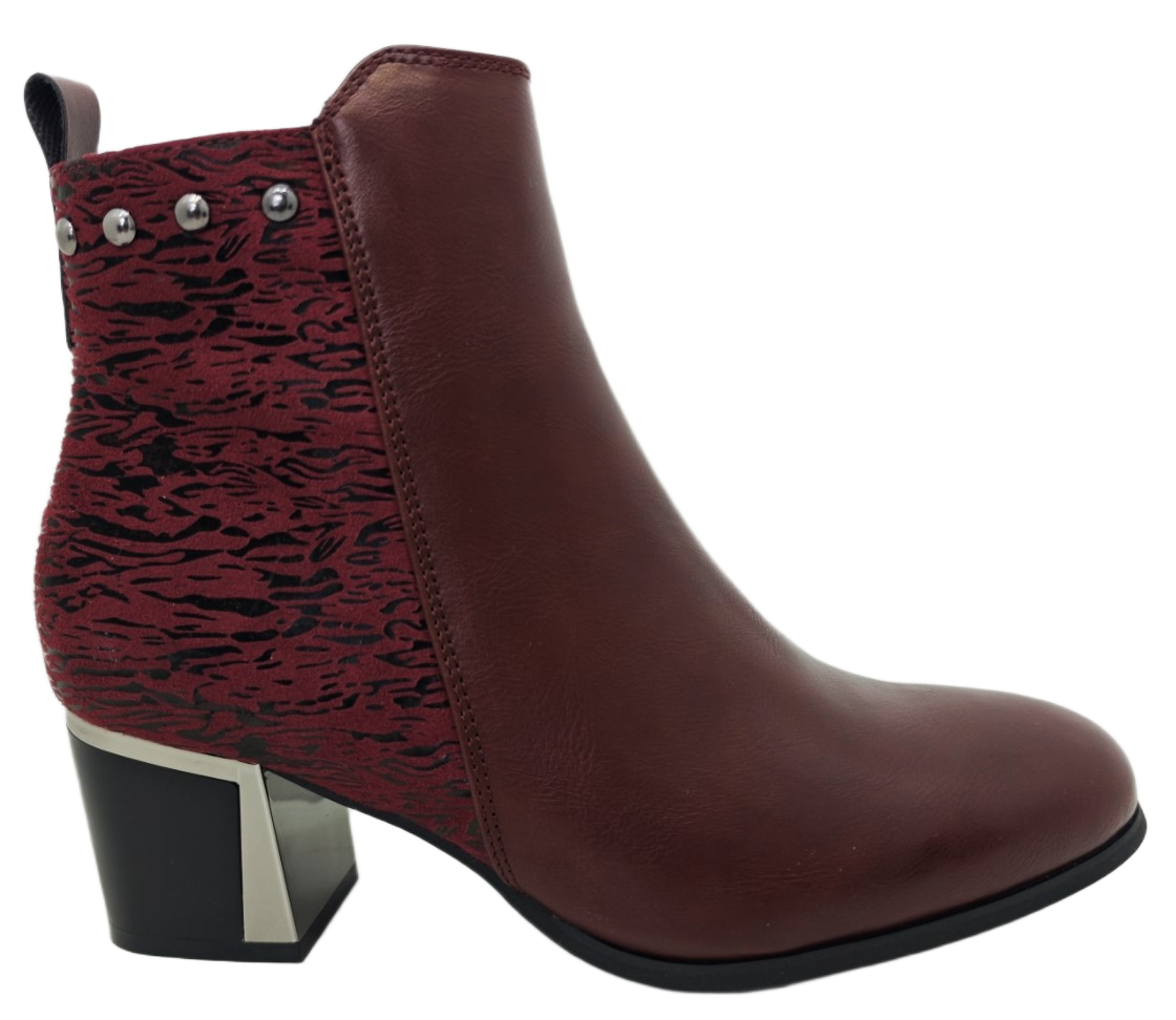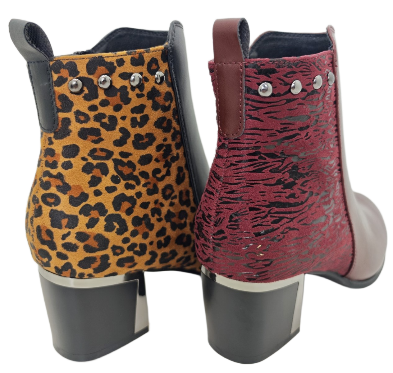Predstavljamo vam elegantne ženske gležnjače koje su savršen izbor za svaku ženu koja cijeni stil i udobnost. Ove prepoznatljive čizme izrađene su od visokokvalitetne bordo eko kože (kombinacija eko glatke i velur kože), što im daje sofisticiran izgled. Jedinstveni dizajn je obogaćen atraktivnim uzorkom u crvenim i crnim tonovima na stražnjem dijelu, dodajući dašak originalnosti. Stabilna blok peta s metalnim detaljima u srebrnoj boji pruža udobnost pri hodu i istovremeno vizualno izdužuje nogu. Gornji rub gležnjača ukrašen je diskretnim metalnim zakovicama, a patent na bočnoj strani će vam olakšati obuvanje. Bilo da ih kombinirate uz kraće pantalone, suknje ili haljine, gležnjače će unijeti dozu elegancije i modernog stila u vašu svakodnevnu kombinaciju. Idealne su za prijelazno razdoblje i hladnije dane, osiguravajući vam udobnost i besprijekoran izgled.
