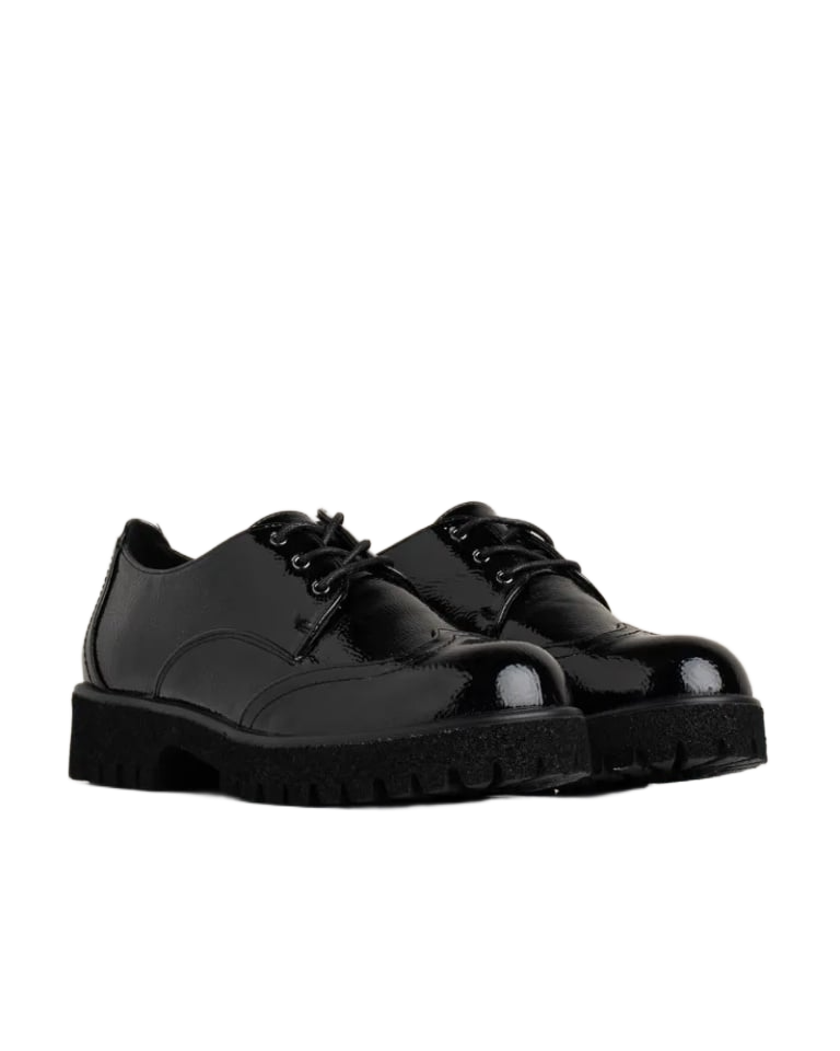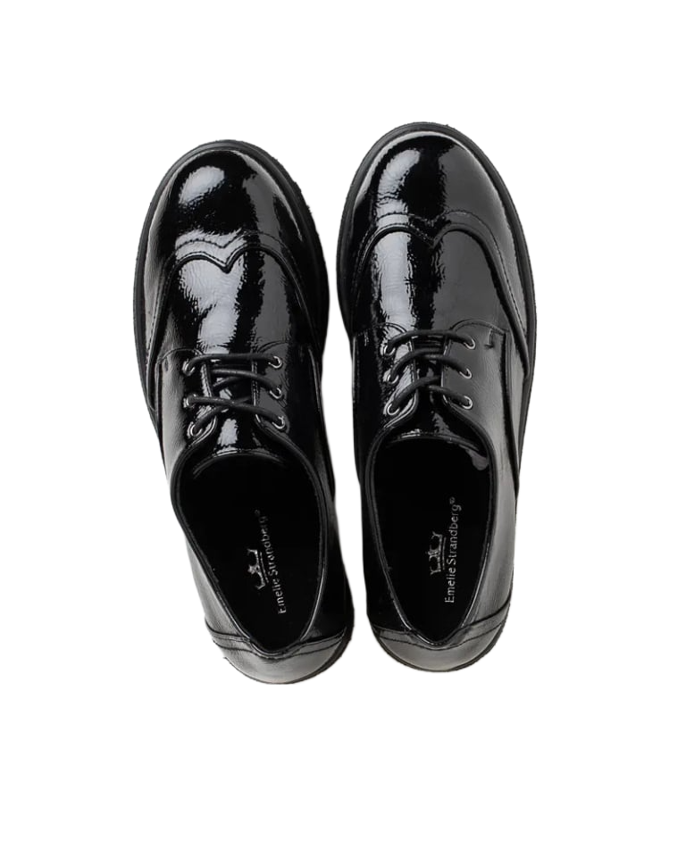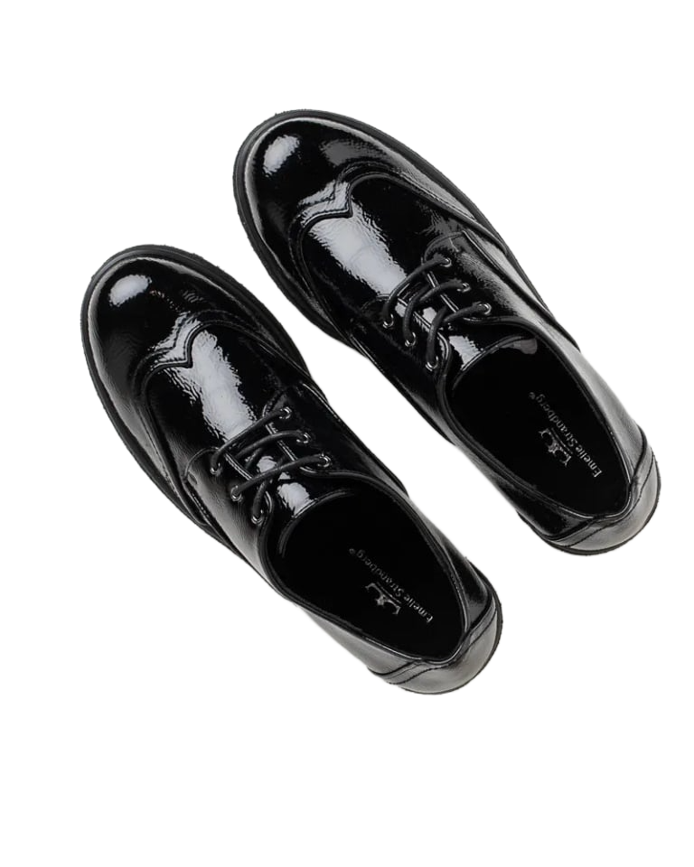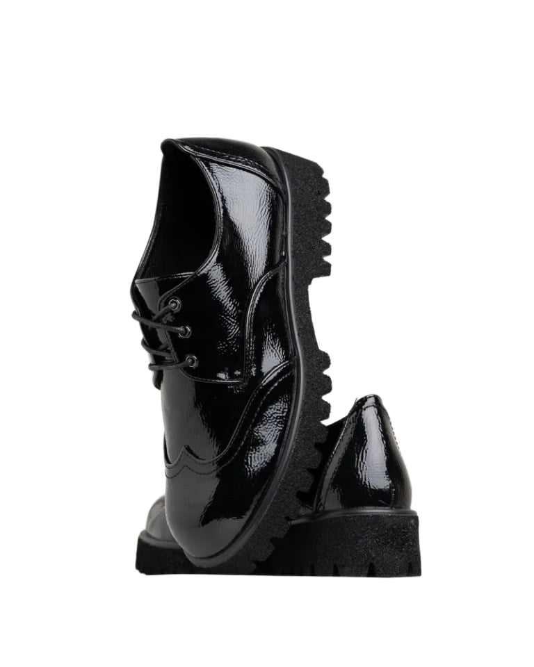Oksfordice/loaferice s vezicama u crnoj boji , visokog sjaja (lakirana eko koža s lakiranim finišom). Karakterizira ih robustan đon s izraženim profilom i klasični brogue detalji (perforacije) na đonu. Model ima povišeni đon za dodatnu visinu i udobnost. Idealne su za kombiniranje u elegantnim, ali i casual odjevnim kombinacijama.