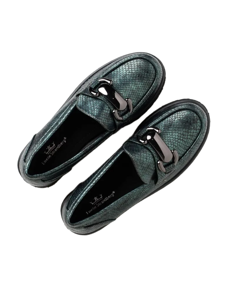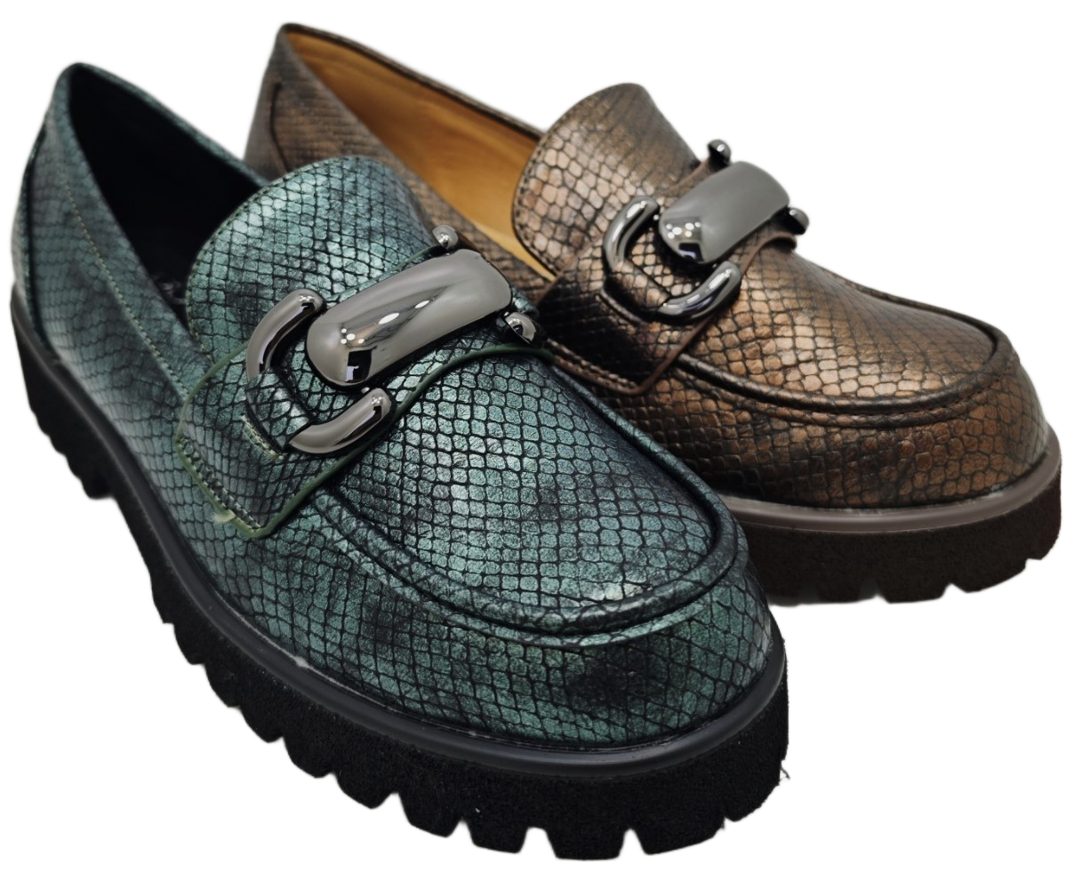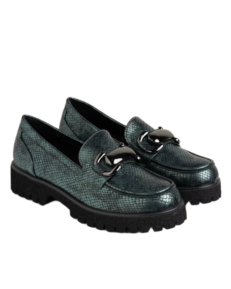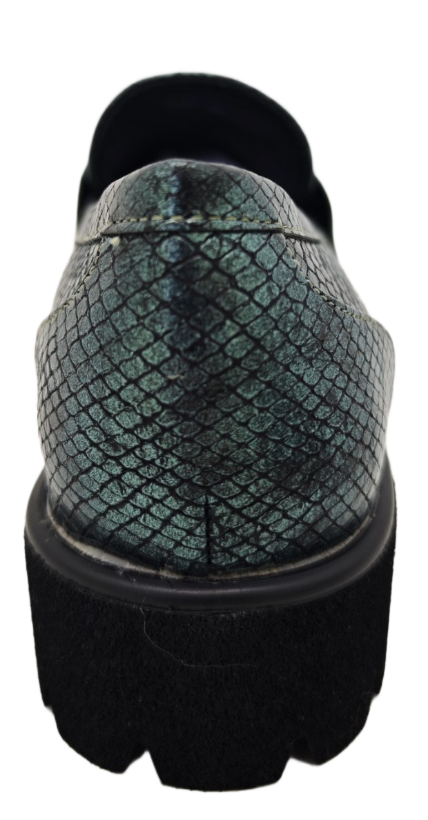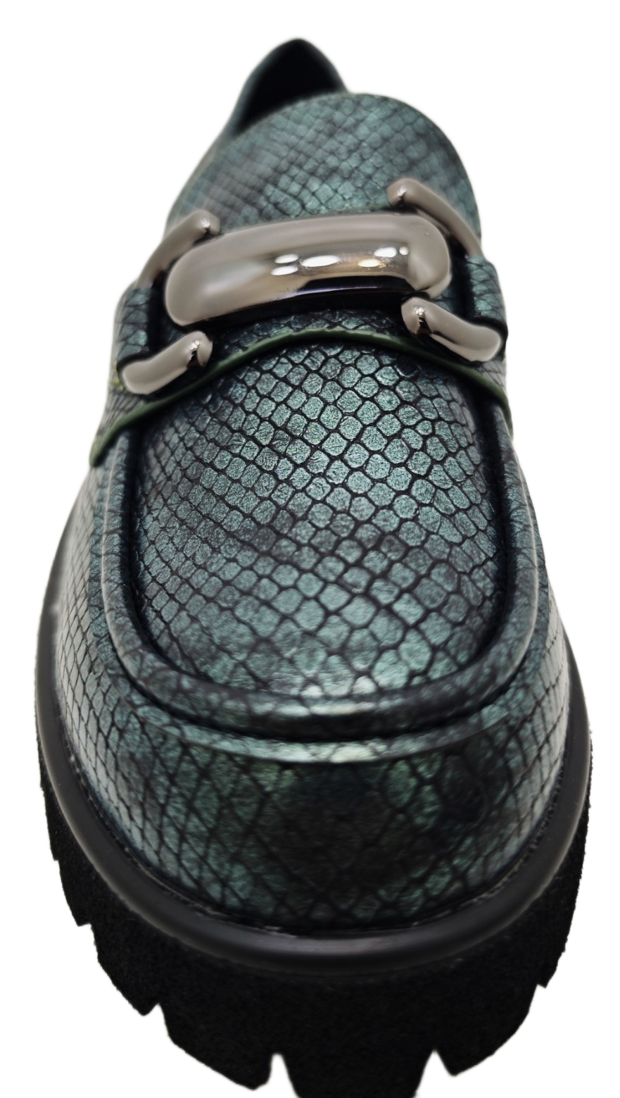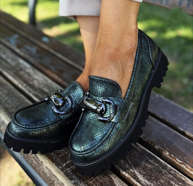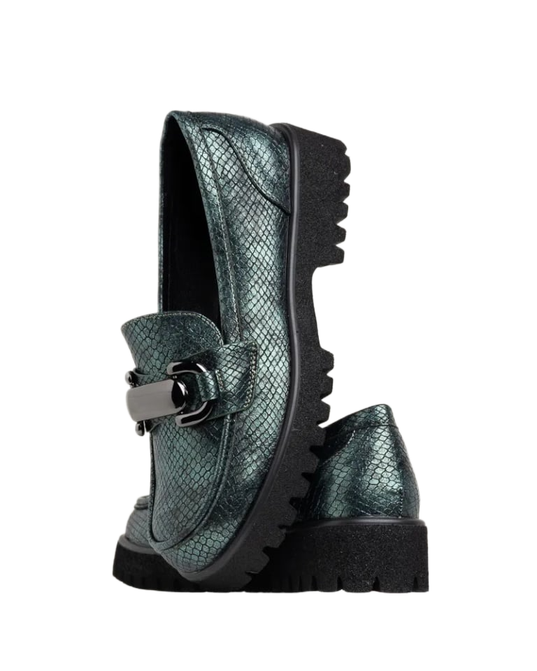 Izrađene od visokokvalitetnog materijala s efektom zmijske kože, ove cipele dolaze u dvije elegantne nijanse: blistavoj tirkiznoj i sofisticiranoj brončanoj. Karakterizira ih robusni, ali udobni đon s izraženim profilom koji osigurava stabilnost i izdržljivost. Metalna kopča na prednjoj strani dodaje dašak luksuza i jedinstvenosti. Idealne za svakodnevno nošenje ili posebne prilike, Ovaj model će unijet prefinjenost u svaku vašu odjevnu kombinaciju.