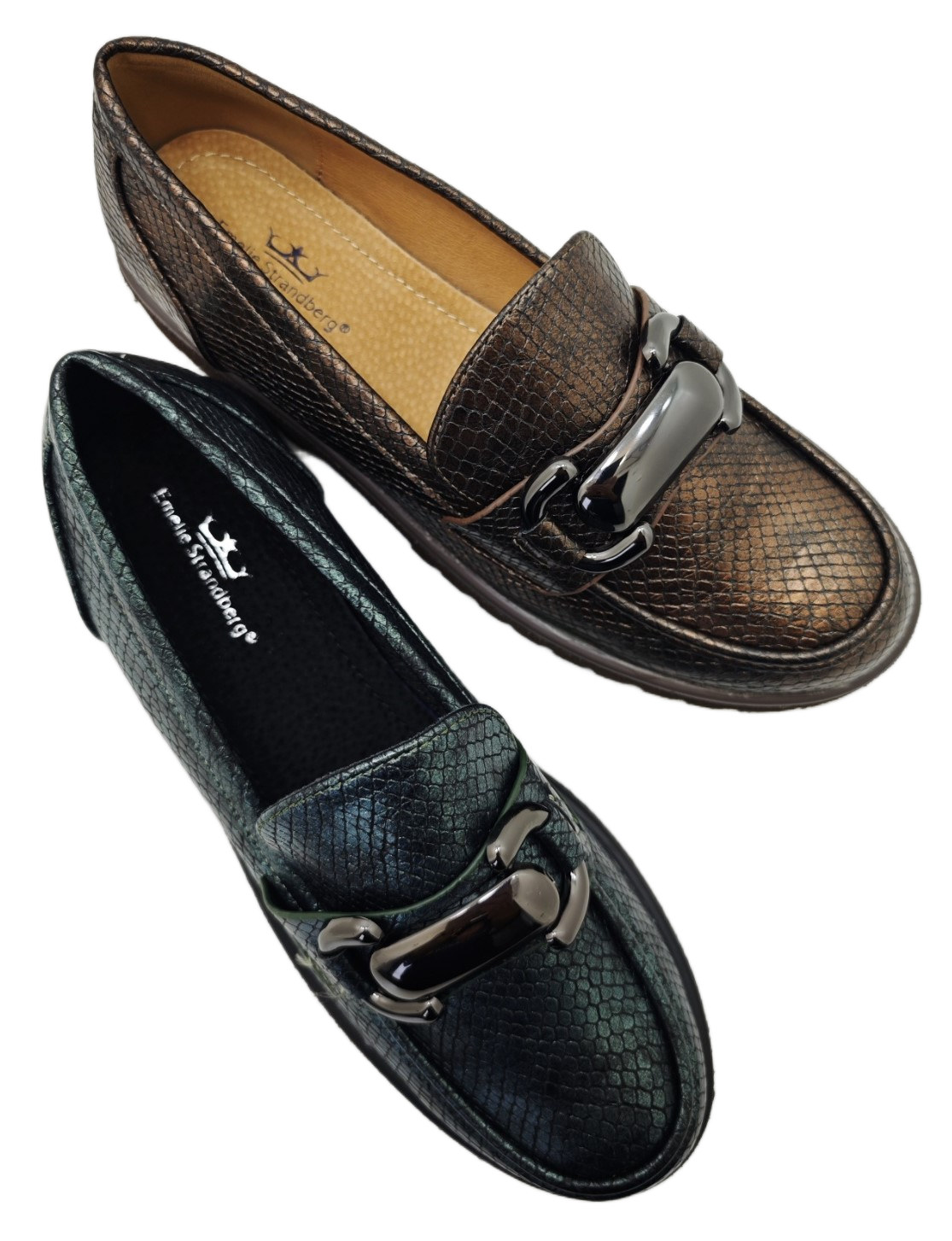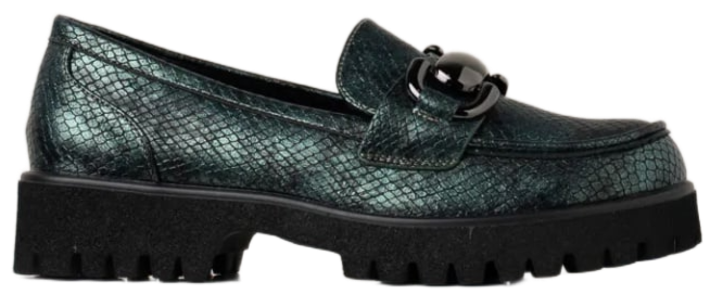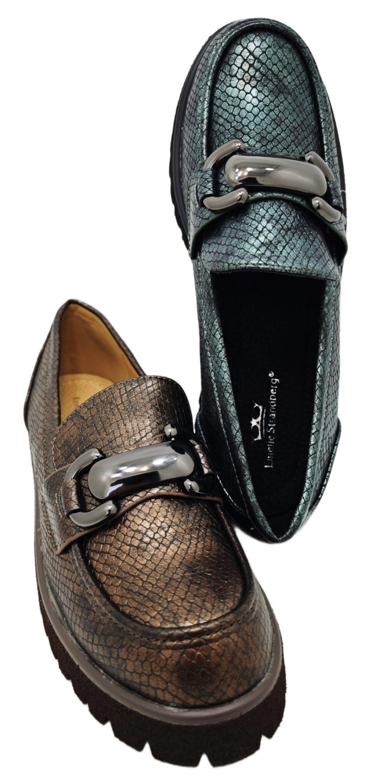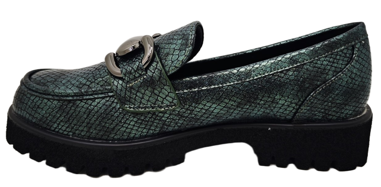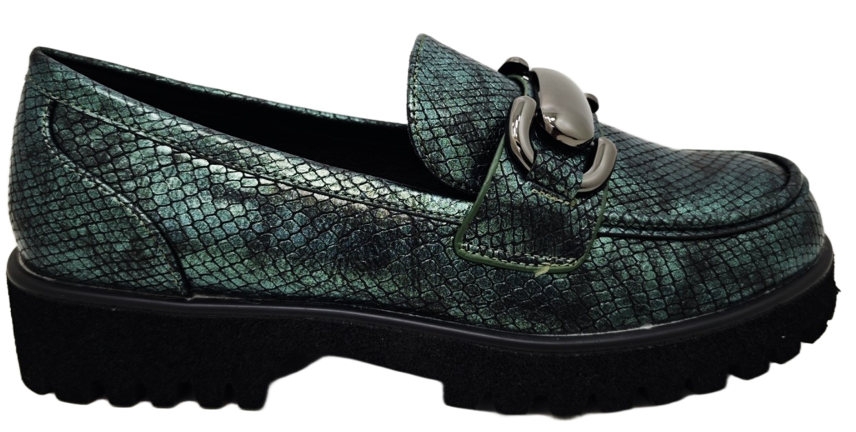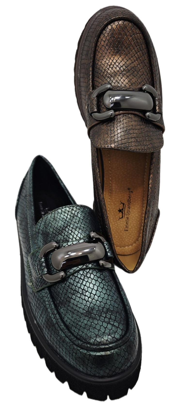 Izrađene od visokokvalitetnog materijala s efektom zmijske kože, ove cipele dolaze u dvije elegantne nijanse: blistavoj tirkiznoj i sofisticiranoj brončanoj. Karakterizira ih robusni, ali udobni đon s izraženim profilom koji osigurava stabilnost i izdržljivost. Metalna kopča na prednjoj strani dodaje dašak luksuza i jedinstvenosti. Idealne za svakodnevno nošenje ili posebne prilike, Ovaj model će unijet prefinjenost u svaku vašu odjevnu kombinaciju.
