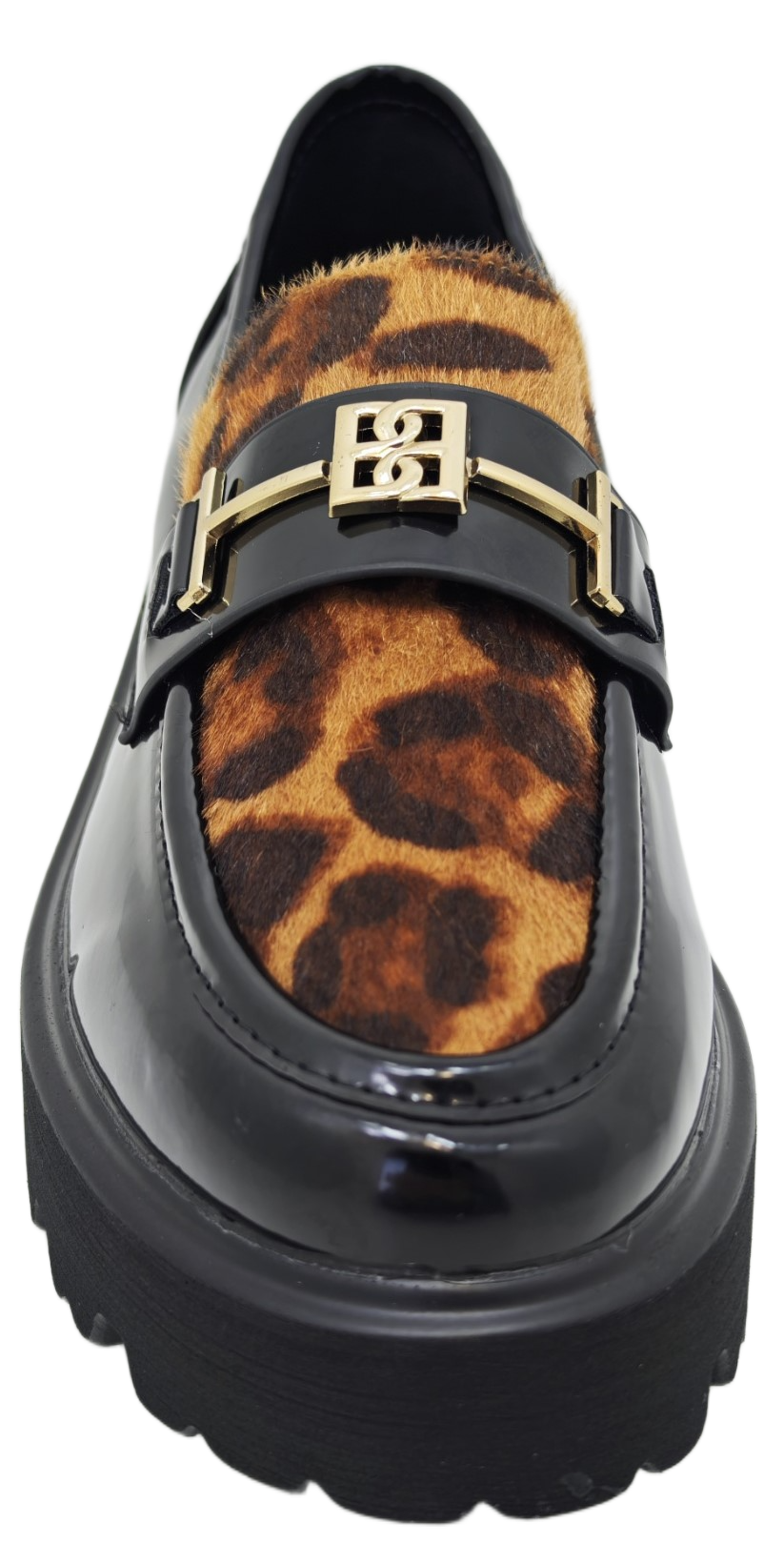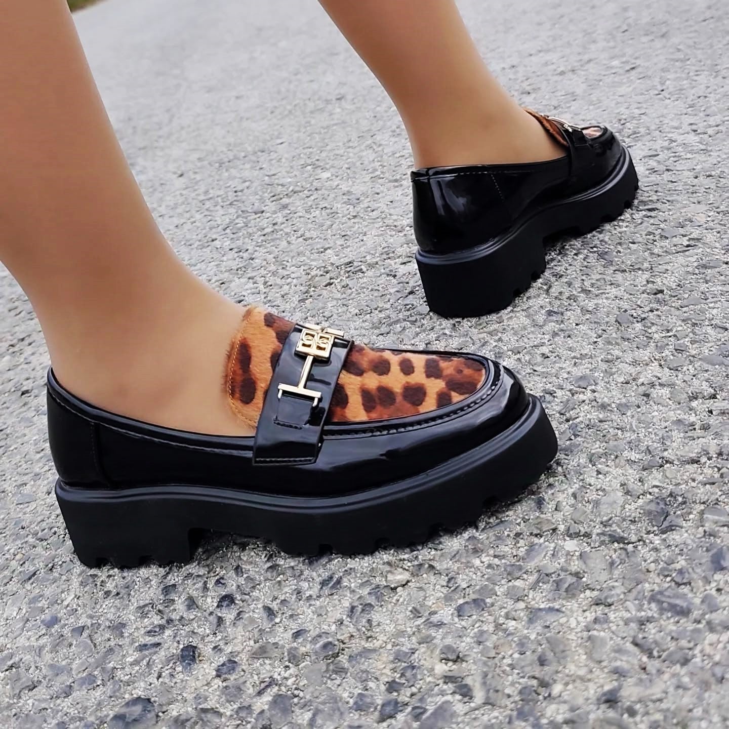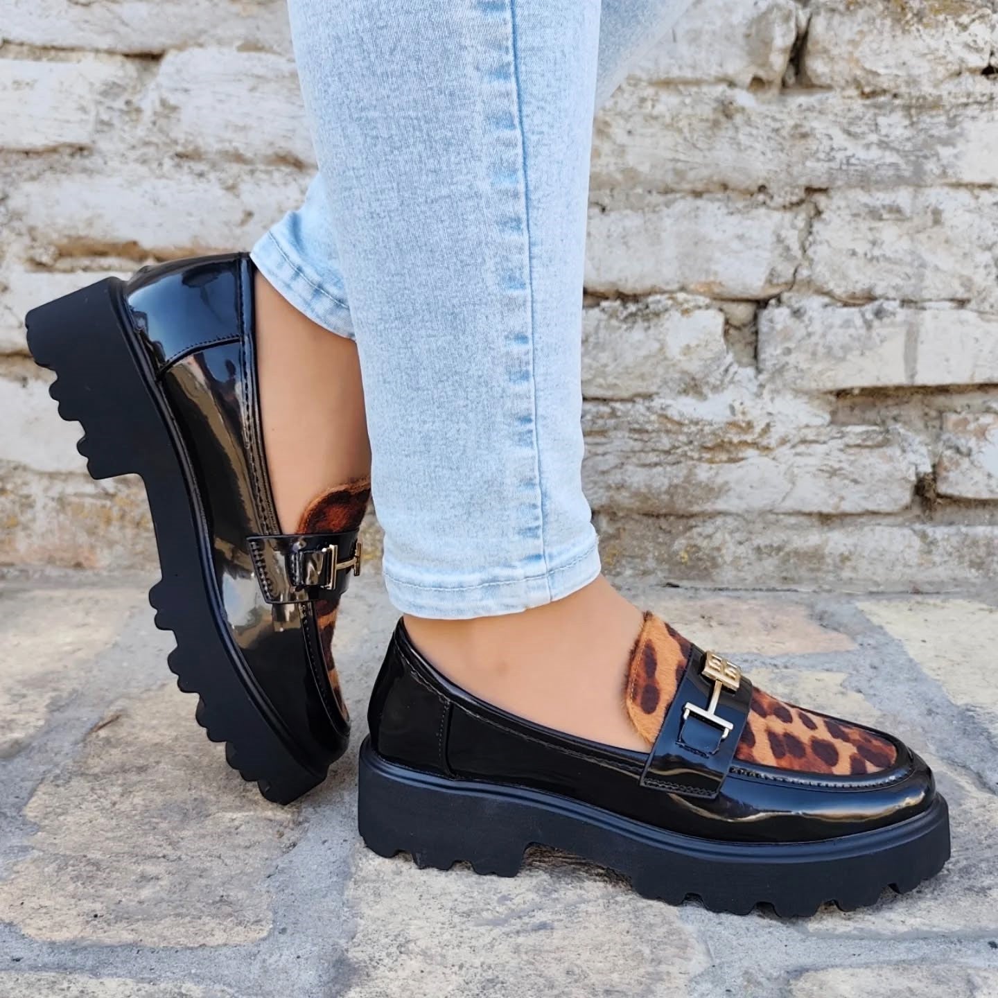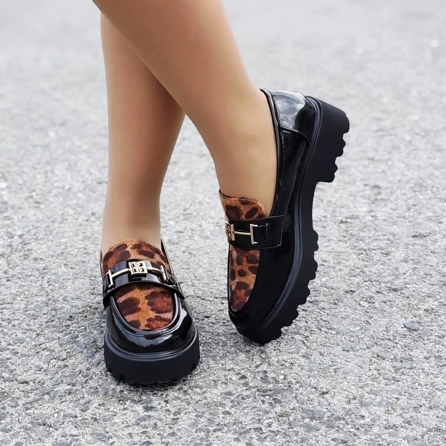 Predstavljamo elegantne ženske mokasine s platformom, savršen spoj klasičnog stila i modernog dizajna. Ove lakirane mokasine crne boje ističu se upečatljivim detaljem leopard uzorka na gornjem dijelu, dodajući dašak divlje elegancije vašem izgledu. Zlatna metalna kopča na prednjoj strani dodatno naglašava sofisticiranost. Debela, robusna platforma s izraženim potplatom osigurava udobnost i stabilnost tijekom cijelog dana, dok istovremeno pruža trendi i odvažan izgled. Idealne za svakodnevne kombinacije, ove mokasine lako se uklapaju u poslovni ili casual stil.
