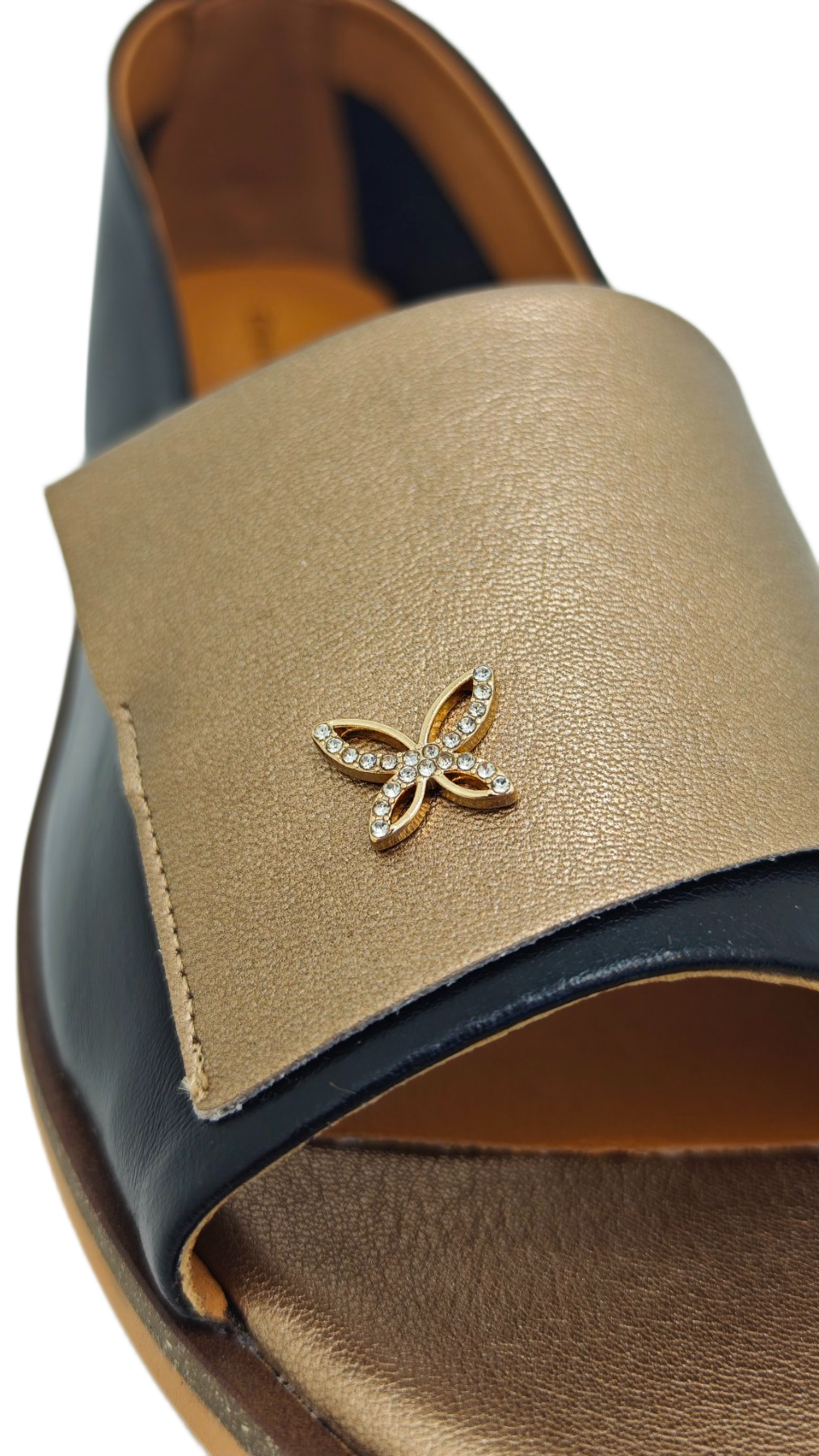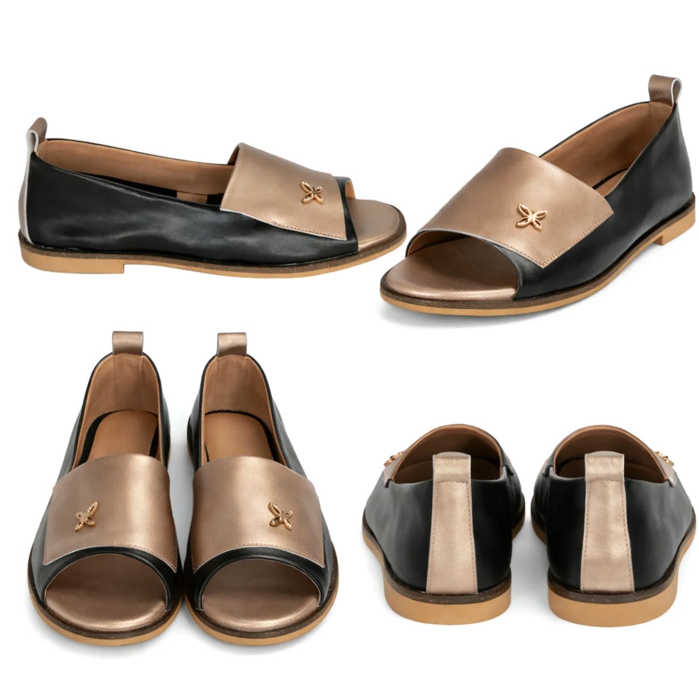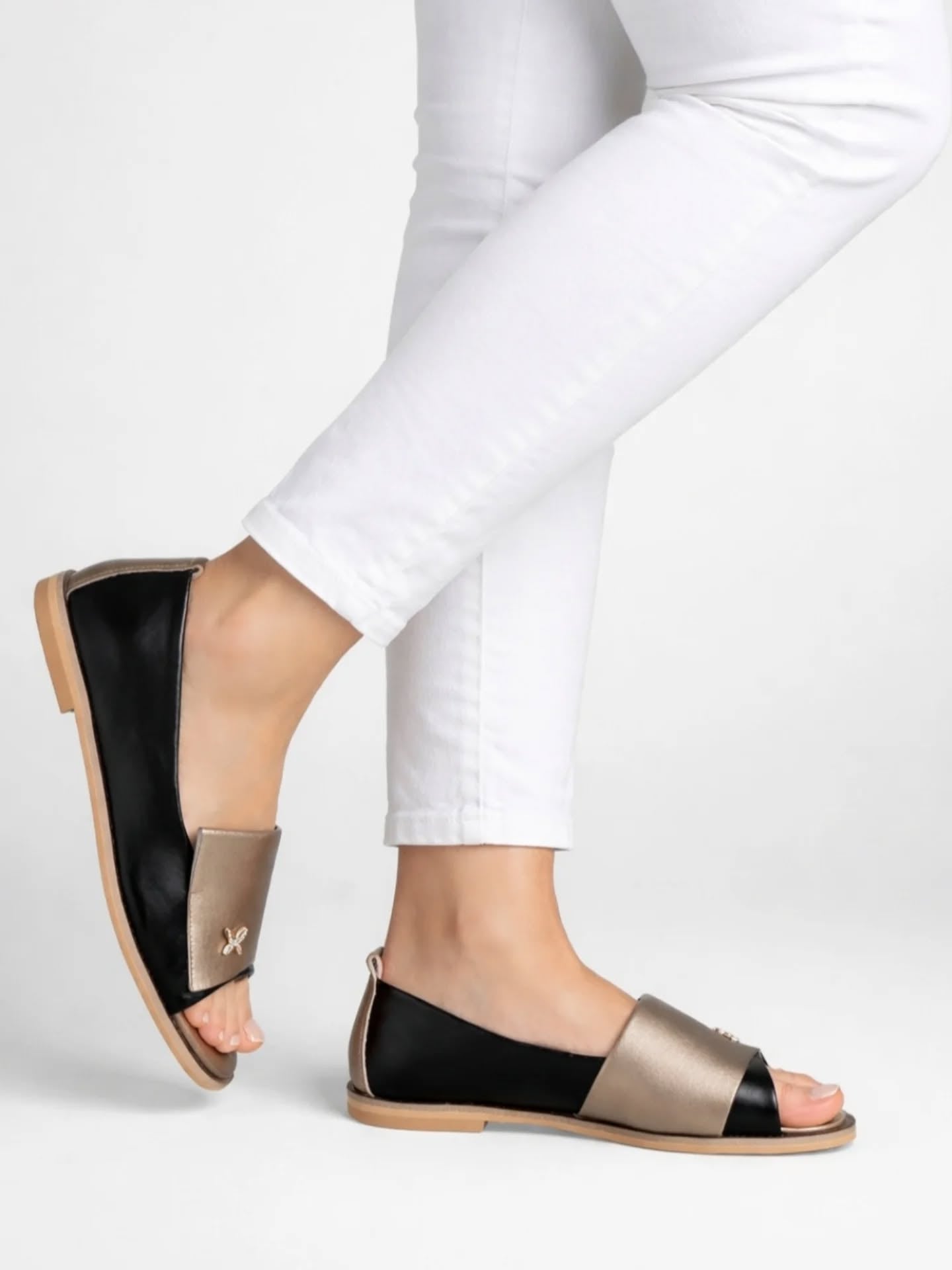 Ove elegantne ženske polusandale dio su nove kolekcije brenda Emelie Strandberg. Model karakterizira moderan dizajn s otvorenim prstima i diskretnim metalnim ukrasom u obliku leptira na prednjoj strani. Ovaj model je popularan izbor za proljetnu i ljetnu sezonu jer spaja eleganciju baletanki s prozračnošću sandala, lako se kombinirajući uz dnevne i večernje odjevne varijante