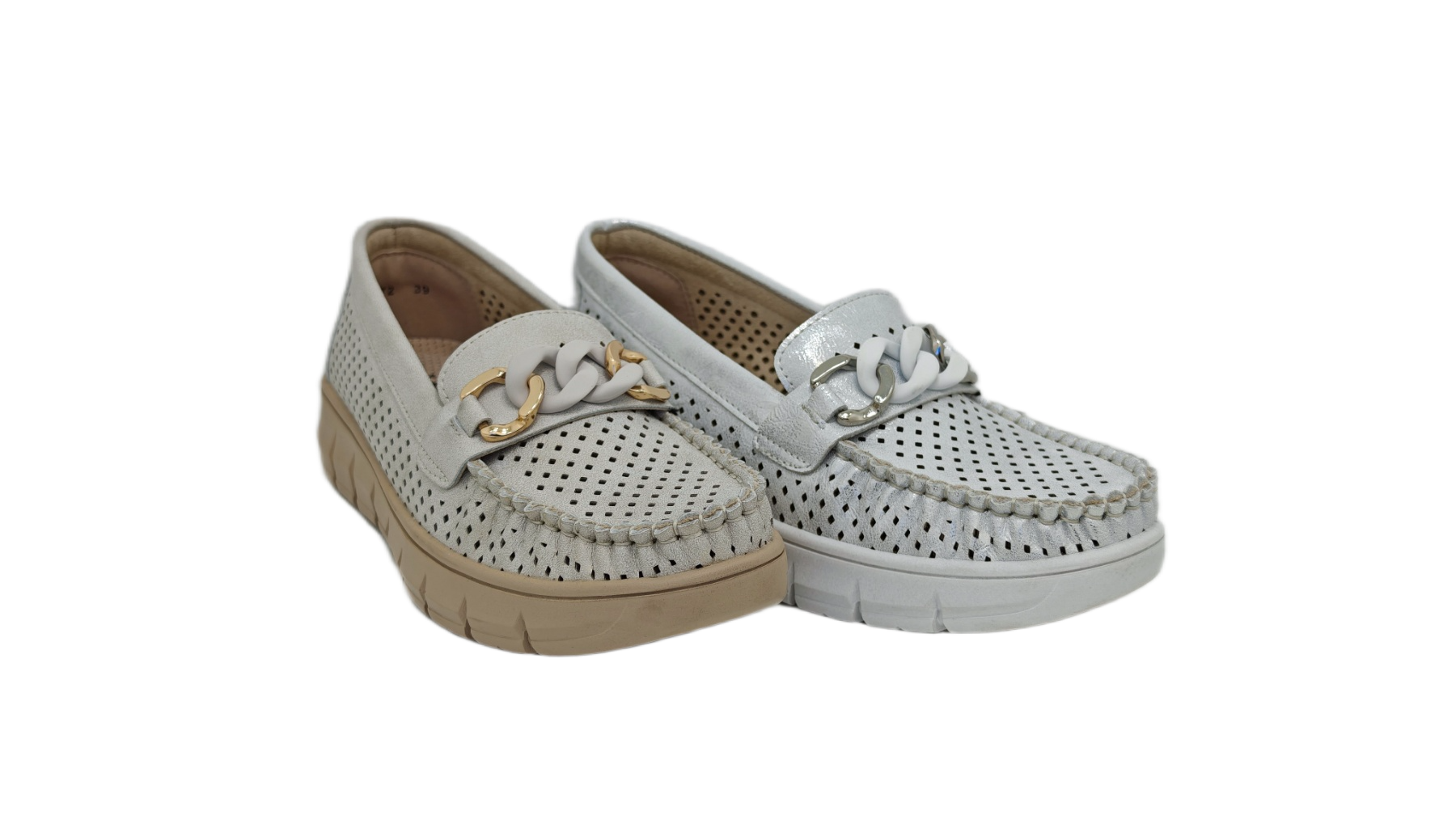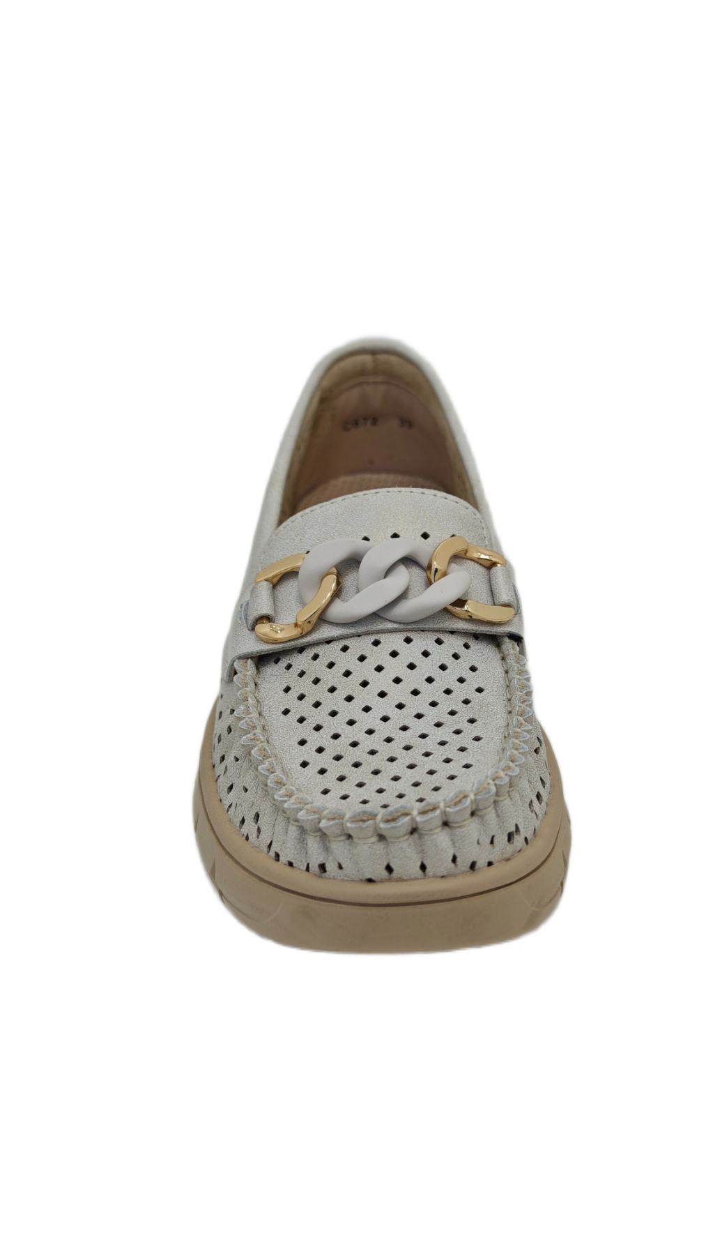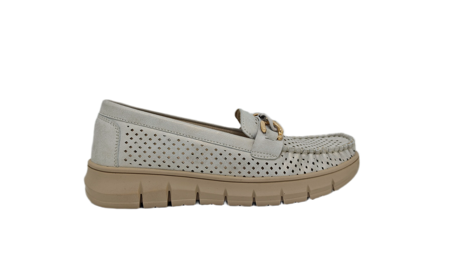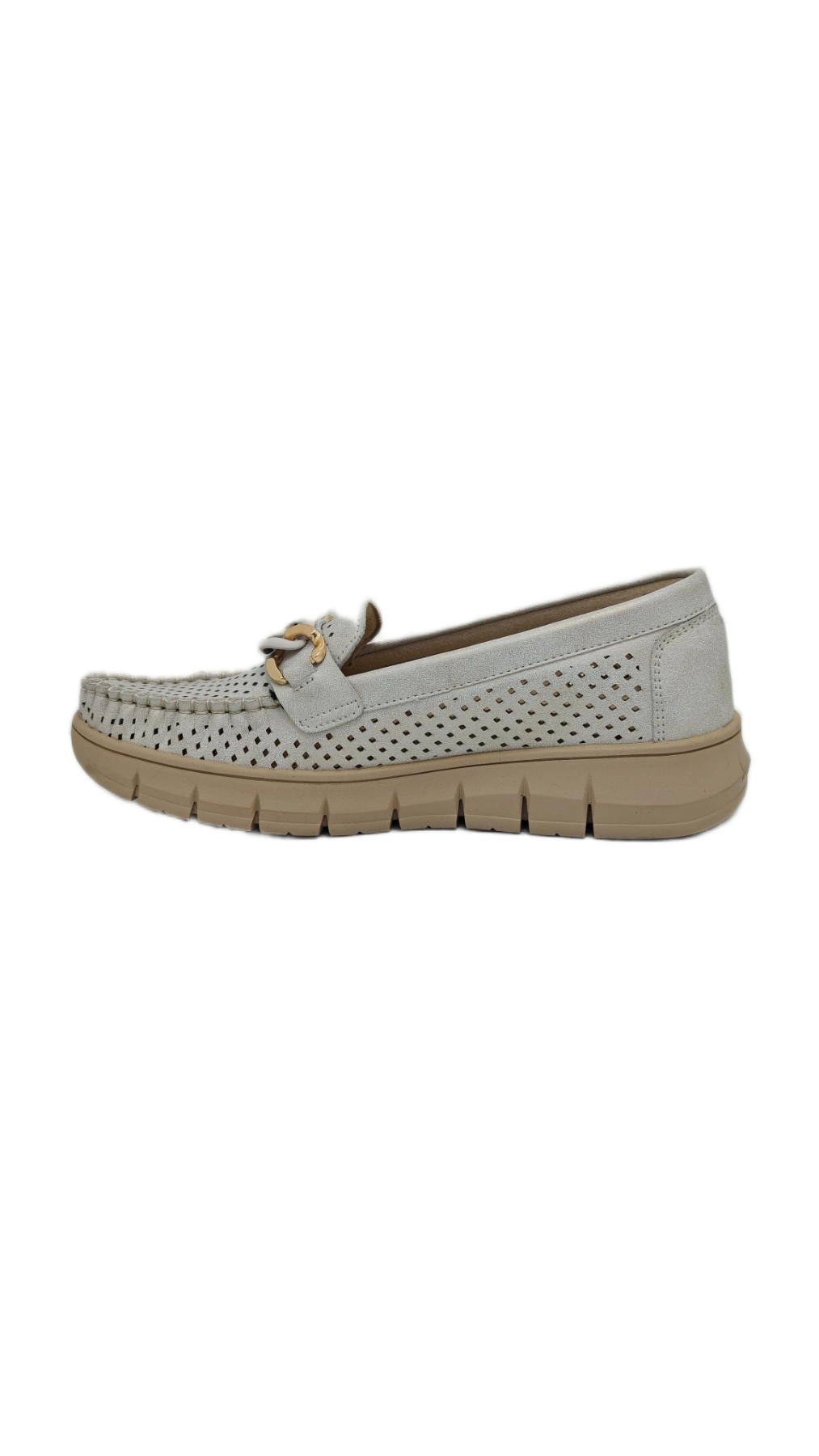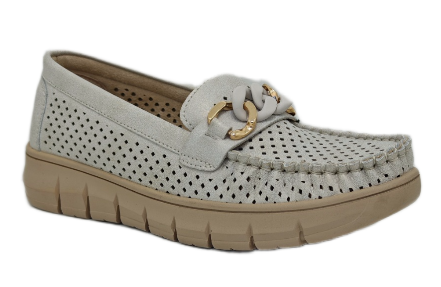 Dekorativni lanac u idelanoj kombinaciji boja, daje ovim ženskim mokasinama jasan modni potpis bez viška detalja. Omogućavaju prozračnost stopala i prijatan osećaj tokom nošenja. Tabanica od prirodne kože dodatno povećava udobnost i podršku stopalu. Đon u istom tonu čini model vizuelno skladnim i lako uklopivim. Lagane i moderne, ove mokasine su odličan izbor za grad i aktivan dan u šetnji.